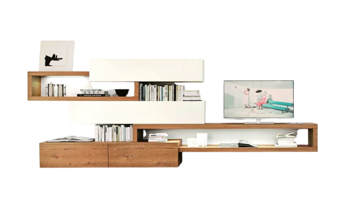 Σύνθεση τηλεόρασης με κρεμαστά στοιχεία τοίχου. Συμμετρική πρόταση που επικεντρώνεται στο θέαμα της τηλεόρασης και του gaming. Η rustic επιφάνεια σε συνδυασμό με τη λάκα τη κάνει να ξεχωρίζει από οποιοδήποτε χρηστικό έπιπλο της κατηγορίας της.
