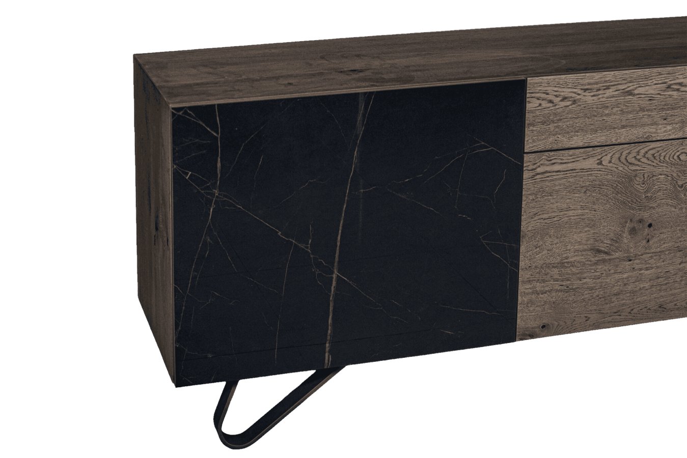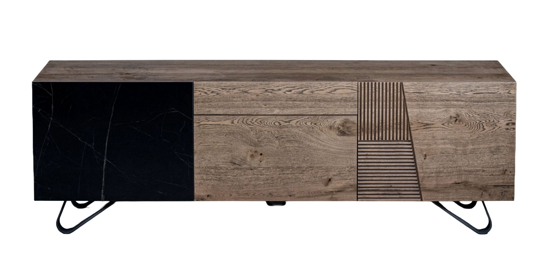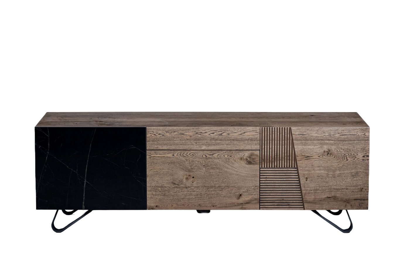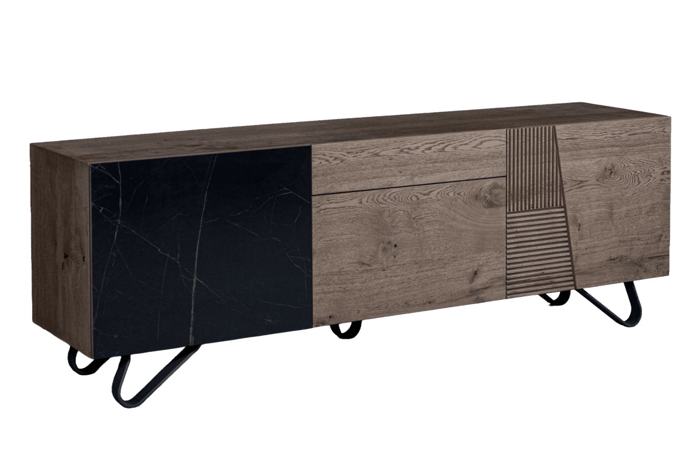 Ένας μπουφές που εντυπωσιάζει με τον ξεχωριστό σχεδιασμό, τον συνδυασμό διαφορετικών, ποιοτικών υλικών και τη δυνατότητα για άφθονο αποθηκευτικό χώρο. Στο design του κυριαρχούν τα γεωμετρικά σχέδια, διαθέτει κεραμική πόρτα, συρτάρι και μεταλλικά πόδια.