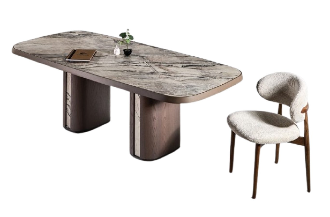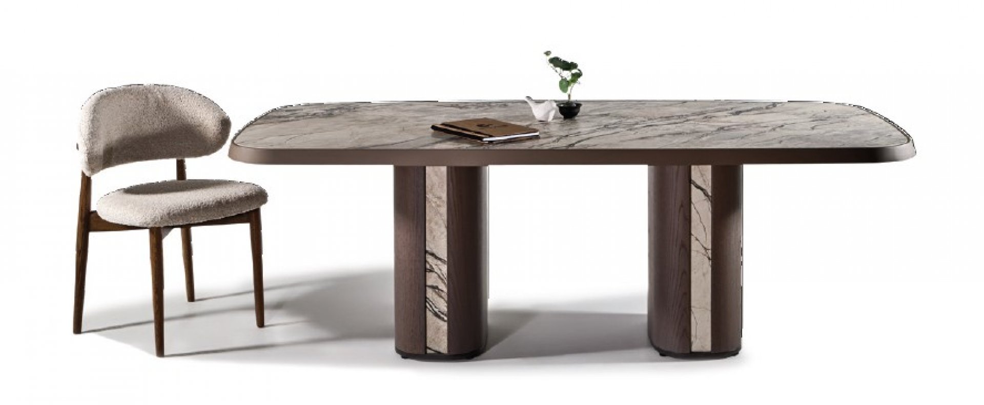 Η κομψότητα του σύγχρονου design συναντά τη δύναμη της φυσικής υφής. Το τραπέζι VERONA εντυπωσιάζει με το χωνευτό κεραμικό καπάκι του και τις στιβαρές ξύλινες βάσεις, διακοσμημένες με κεραμική ''γραβάτα'' που προσθέτει μια νοτα πολυτέλεις